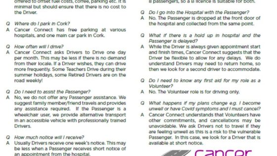 Cancer Connect has free parking at various hospitals, and one main car park in Cork.